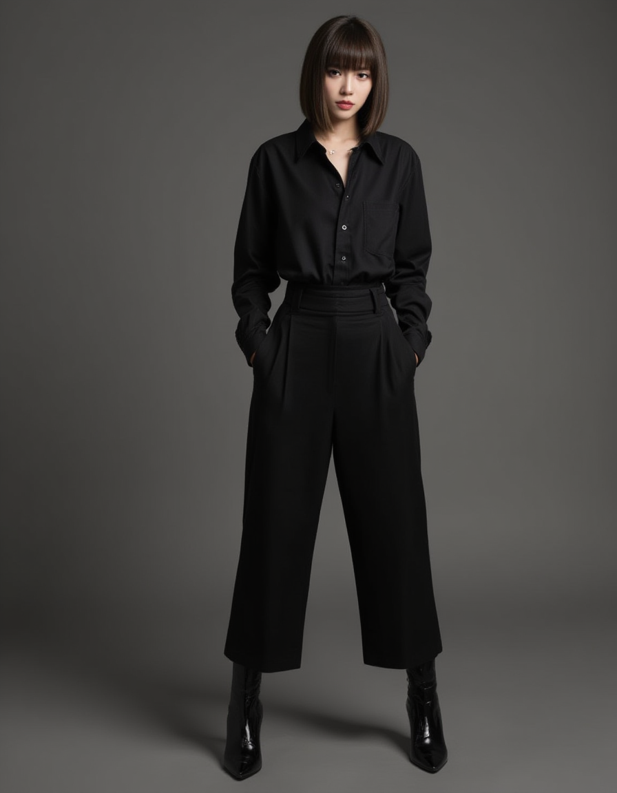 첫 번째 스타일은 올블랙 코디로 시크한 매력이 가득한 룩입니다. 블랙 셔츠와 하이웨스트 슬랙스를 매치해 단정하면서도 프로페셔널한 분위기를 연출할 수 있어요. 여기에 블랙 앵클 부츠까지 더해져 완벽한 올블랙 룩 완성! 데일리 오피스룩 또는 모던한 외출룩으로 추천드립니다.